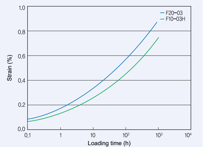 ➤上图中可见,在恒定的拉力下,高粘聚甲醛F10-03H相对于中粘聚甲醛F20-03在相同的时间,具有更小的形变量,即高粘聚甲醛F10-03H具有更好的耐蠕变性。